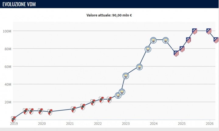 03月16日讯 今日德转更新西甲球员身价,马竞前锋阿尔瓦雷斯身价下降1000万欧元,从1亿欧元降至9000万欧。